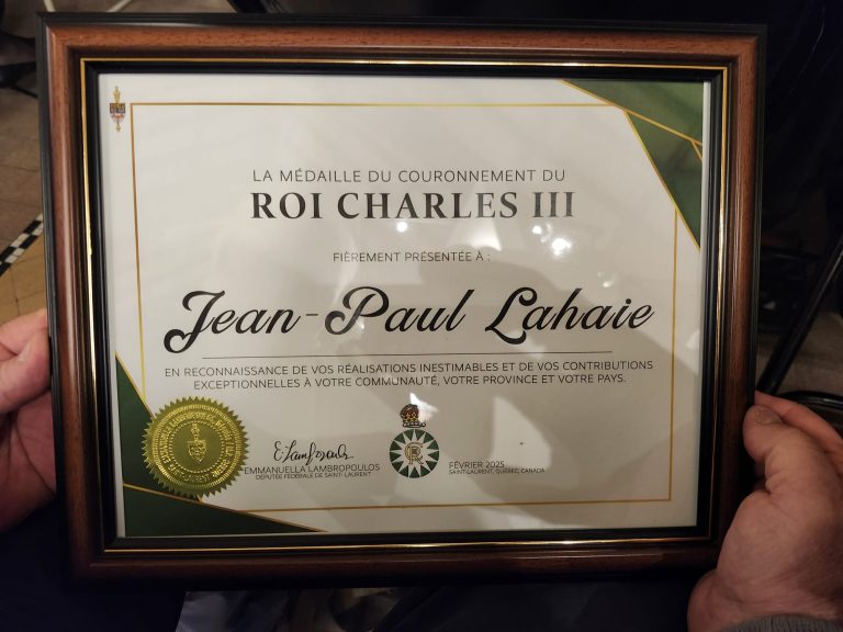 La remise de la Médaille de couronnement du roi Charles III par Mme Emmanuella Lambropoulosdéputée de Saint-Laurent, à M. Jean-Paul Lahaie, Président du CA de l’AQDR/ASTL, pour ses réalisations exceptionnelles et ses contributions à la société canadienne et à sa communauté.